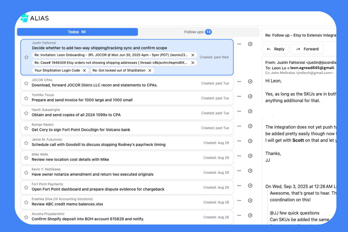 Managing your inbox isn’t work. Acting on it is. That’s why Alias AI transforms the emails you open into a central hub of tasks and follow-ups — so you can focus on getting things done, not on digging through threads.