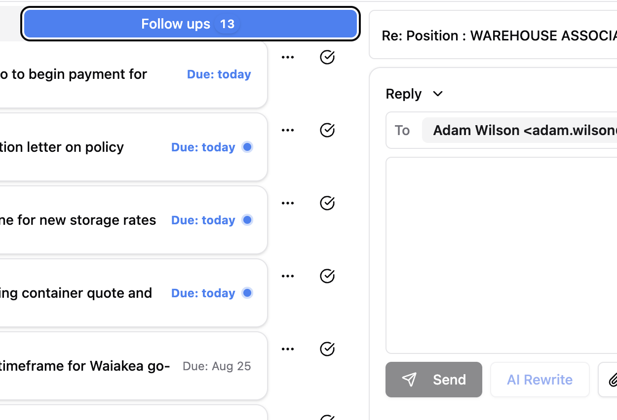 Forget bouncing back and forth between your inbox and a task manager. From within your Productivity Hub, you can reply to any email thread directly from the task or follow-up where it appears. This keeps you in flow and dramatically cuts the time wasted on context-switching.